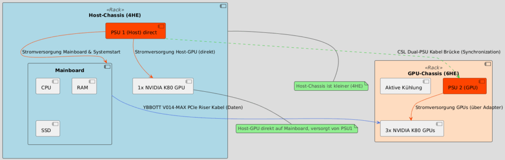- Logische Trennung der Stromversorgung: PSU 2 (GPU) versorgt ausschließlich die 3 K80-Karten. Die [CSL Dual-PSU Kabel Brücke] synchronisiert PSU 1 und PSU 2.